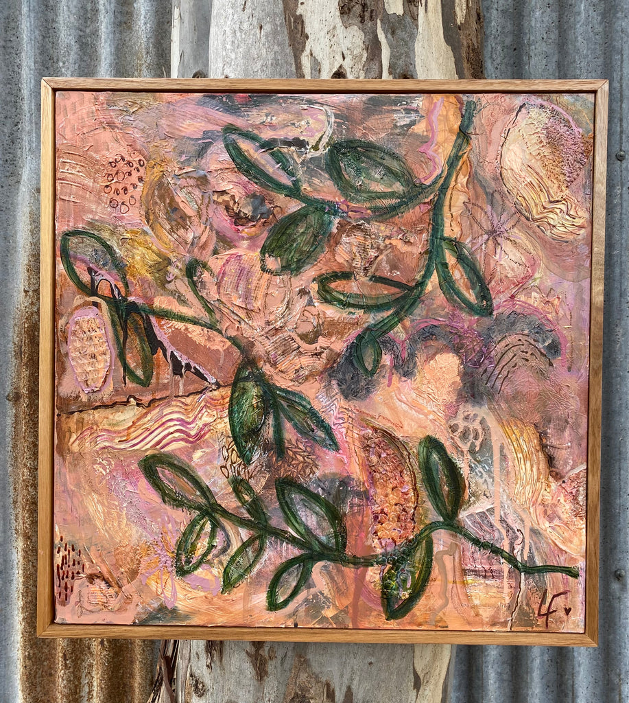 Acrylic, mixed media on canvas. 25 inch x 25 inch (63cm x 63cm) - framed.