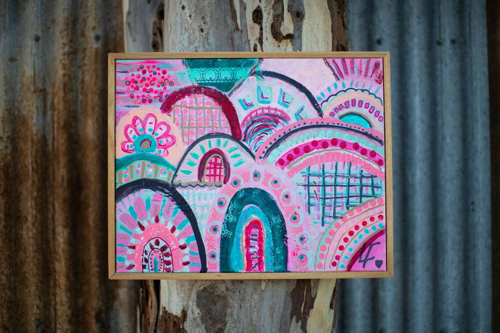 Acrylic, mixed media on canvas. 43cm x 53cm - framed. This one made me feel really happy when I was painting it. I hope the girl who it is gifted to feels just as happy when she receives it x.