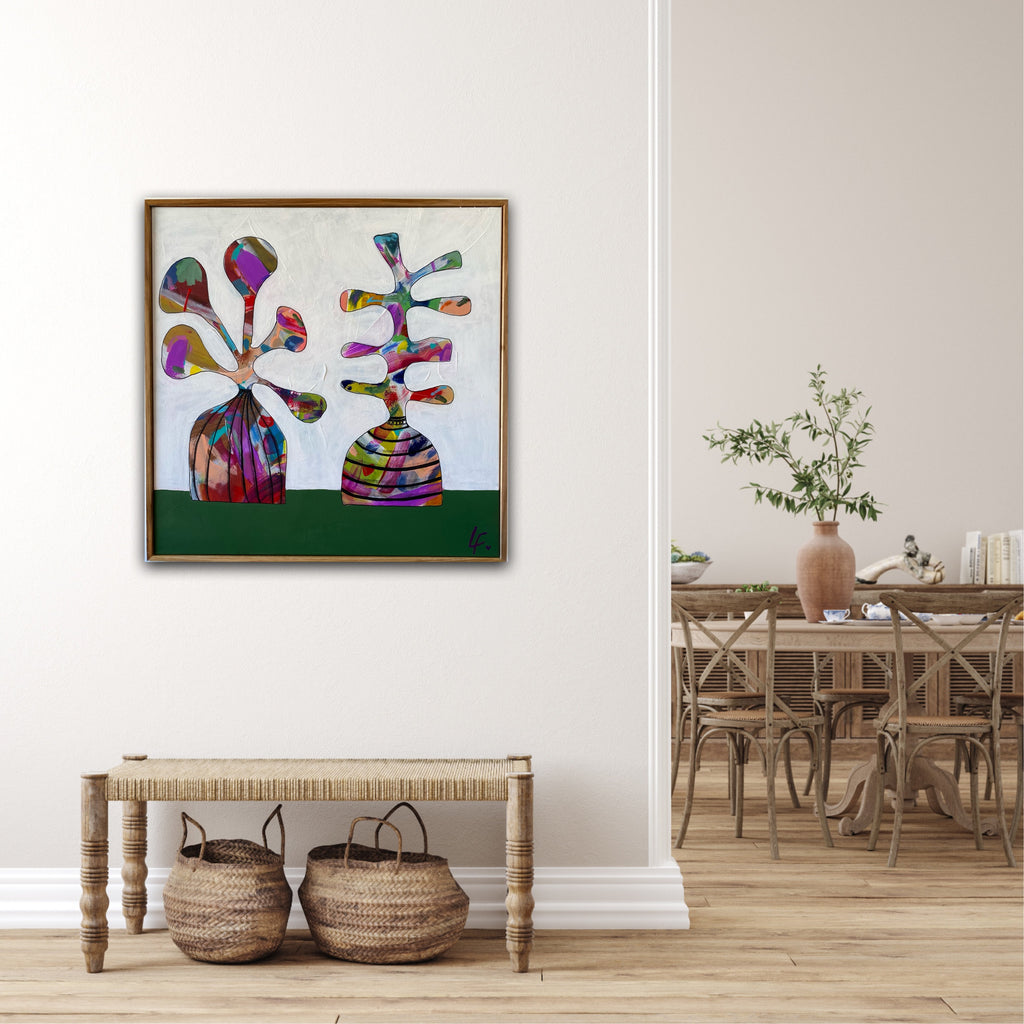 Acrylic, mixed media on canvas- framed. 79 cm x 79cm - framed. This one is part of the “Happy Days” series.