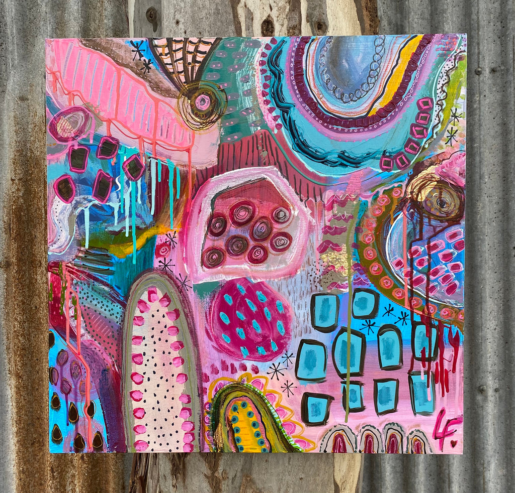 Acrylic, inks, paint pens, pastels, collage and gold leaf on canvas 63cm x 63cm - framed.